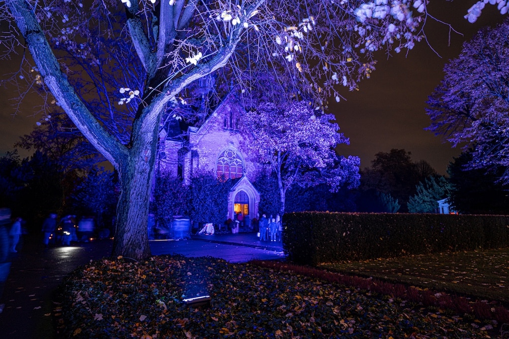 Als die Dämmerung hereinbrach, erstrahlten Kapelle, Lindenallee und ausgewählte Grabmale in eindrucksvollen Farben. Sanfte Lichtspiele zeichneten die alten Baumkronen nach, während leuchtende Akzente die historischen Grabstätten betonten. Das Spiel aus Licht und Schatten verlieh dem Friedhof eine fast magische Atmosphäre – ein Ort des Gedenkens, der zugleich zu einem sinnlichen Erlebnis wurde.