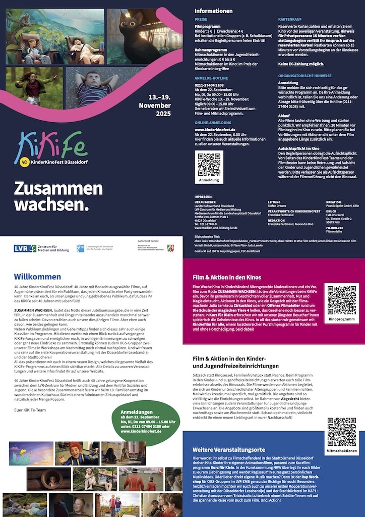 Das Programm des 40. KinderKinoFest (KiKiFe) ist ab sofort unter www.kinderkinofest.de abrufbar. Dort finden sich sowohl eine Online-Anmeldeoption als auch eine Übersicht aller Angebote. Anmeldungen sind über die Website oder telefonisch beim KiKiFe unter 0211–274043108 möglich. Der Eintritt in den Kinos beträgt drei Euro für Kinder und vier Euro für Erwachsene. Begleitpersonen institutioneller Gruppen erhalten freien Eintritt. Die Angebote in den Kinder- und Jugendfreizeiteinrichtungen sind meist kostenfrei.