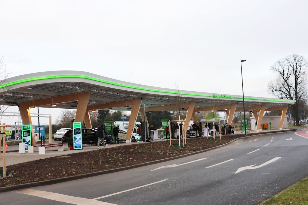 Ein besonderer Schwerpunkt liegt auf der nachhaltigen Energieversorgung: Die rund 50 Meter lange Überdachung des Ladeparks ist mit einer Photovoltaikanlage ausgestattet, die eine Spitzenleistung von 57 Kilowatt liefert. Ein Teil des vor Ort benötigten Stroms wird so direkt aus Sonnenenergie erzeugt. Bei geringer Sonneneinstrahlung beziehen die Ladepunkte zertifizierten Ökostrom aus dem Netz.