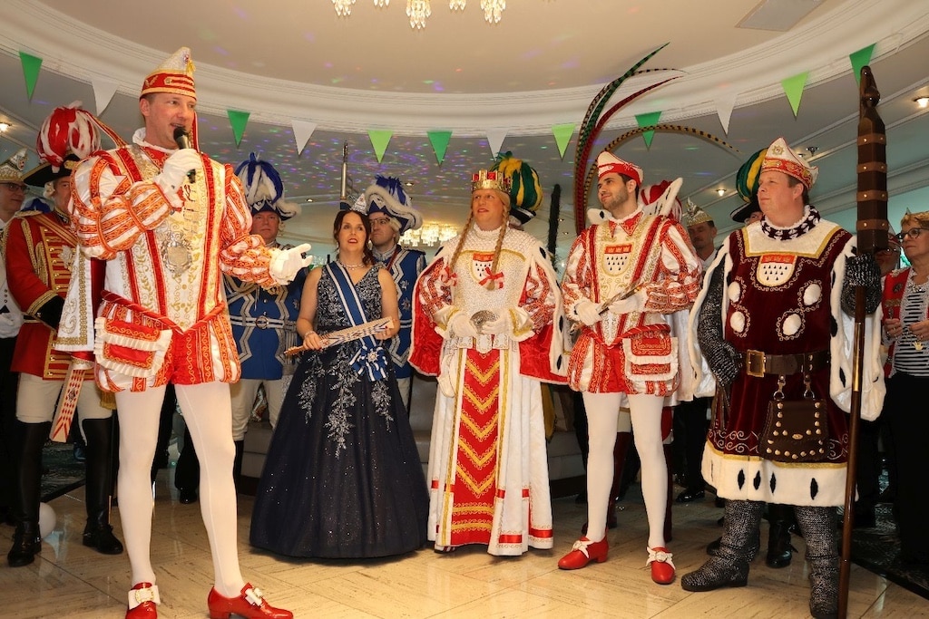 Höhe­punkt des Köl­ner Auf­ent­halts war um 13.30 Uhr der Besuch des Köl­ner Drei­ge­stirns der Ses­sion 2026: Jung­frau Aenne, Prinz Niklas I. und Bauer Cle­mens, beglei­tet vom Fest­ko­mi­tee Köl­ner Kar­ne­val. Das Drei­ge­stirn, das aus den Rei­hen der Prin­zen-Garde Köln 1806 e.V. stammt und unter dem Motto „ALAAF – Mer dun det för Kölle“ steht, wurde an Bord fei­er­lich empfangen.