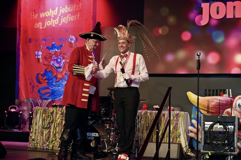 Ein wei­te­rer Höhe­punkt folgte mit Vol­ker Wei­nin­ger alias „Der Sit­zungs­prä­si­dent“, der mit treff­si­che­rem kar­ne­va­lis­ti­schem Humor und selbst­iro­ni­schem Blick auf das när­ri­sche Brauch­tum lang anhal­ten­den Applaus erhielt. Offi­zi­el­len kar­ne­va­lis­ti­schen Glanz brachte anschlie­ßend das Prin­zen­paar der Ses­sion, Prinz Mar­cus I. und Vene­tia Nicole, in den Henkel-Saal.